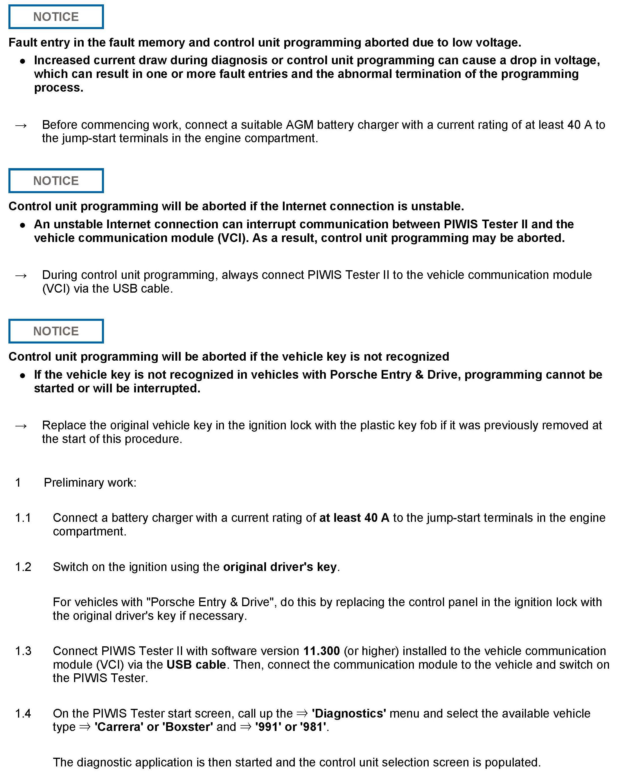 Until such a time as PIWIS Tester software version 11.700 becomes available, the PDK control unit (transmission control) must be re-programmed using PIWIS Tester II with test software version 11.300 (or higher) installed if fault code P1767 is entered. See "Procedure" section.
