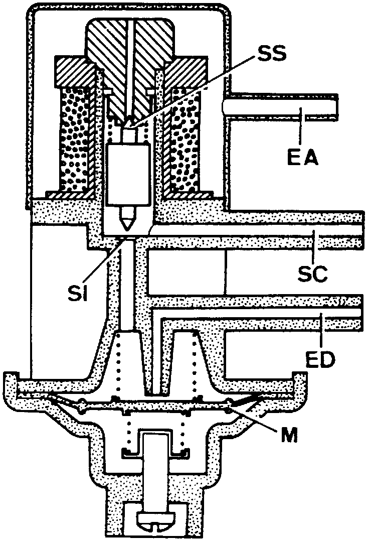 The vacuum solenoid regulator, Fig. 15, consists of two parts. The lower part receives vacuum from the intake manifold through an orifice (ED), which operates the regulator valve through a diaphragm (M), Fig. 15. The upper part of the regulator is a three way electromagnetic solenoid. When non-energized, the core is in the bottom position, closing off passage (SI). the vacuum output to the carburetor is vented to the atmosphere, allowing for a richer mixture. When the solenoid is energized, the core is in the top position allowing the carburetor actuators to be connected to the controlled manifold vacuum passage, and providing leaner mixtures.