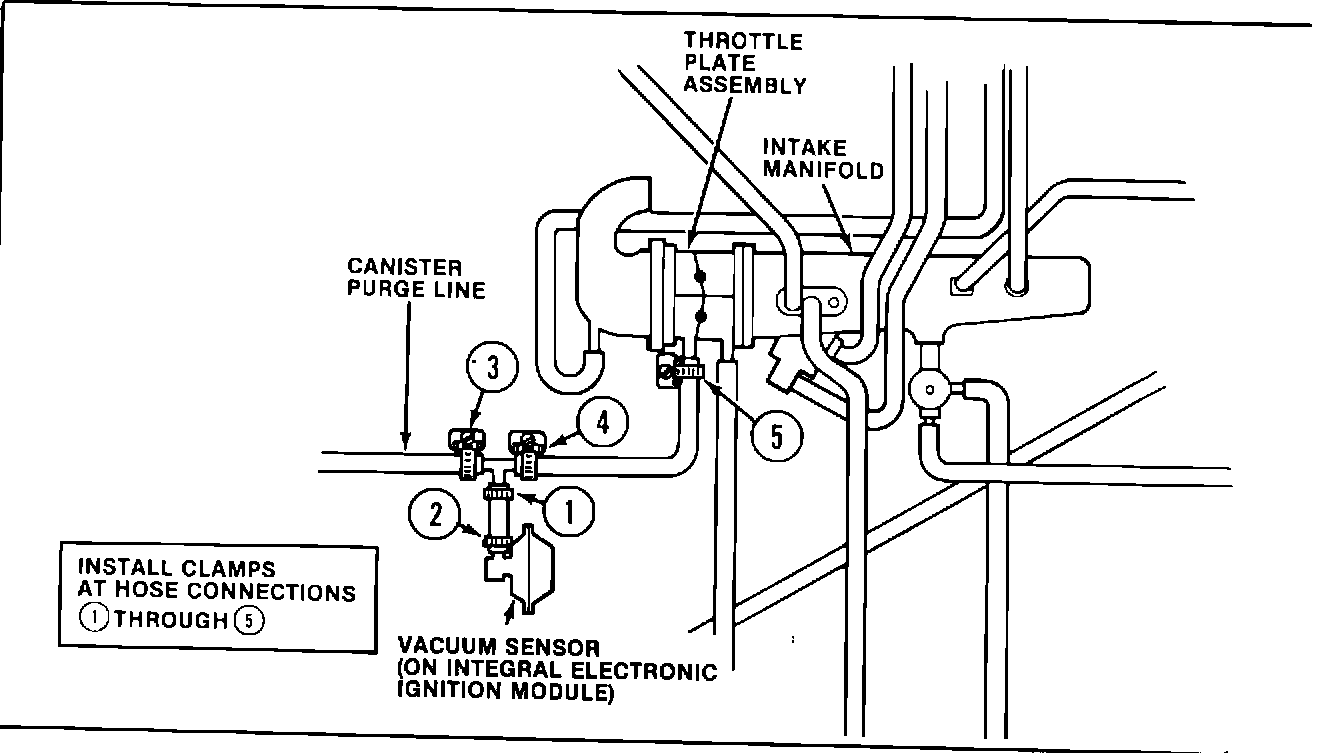 FIGURE 1 - HOSE CLAMPS INSTALLED AT I.E.I. VACUUM SENSOR AND CANISTER PURGE LINE CONNECTIONS: