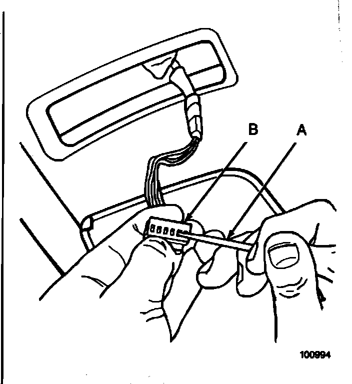 3. Tighten the terminal connector. Insert a terminal pin (A) (fine pointed awl or test lamp probe) into the connector terminal (B) and pry the terminal pins in an upward direction. Be sure the receiver has good electrical contact.