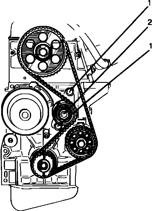 4. Remove timing belt cover, loosen tensioner bolt (1) and tensioner (2), Fig. 8, then remove timing belt.