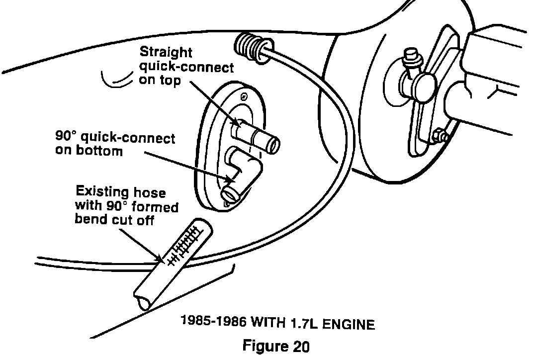 Installation of Heater Core Quick-Connects and Hoses1. Install the supplied 90 degrees quick-connect on the bottom (inlet) heater core nipple and the straight quick-connect on the top (outlet) heater core nipple (Fig. 20).
