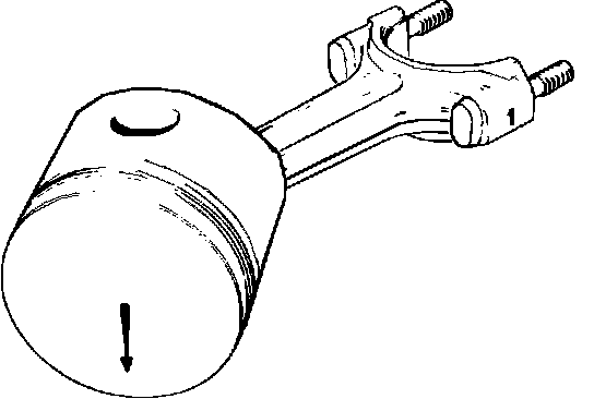 Using a press to press the piston pin, mount the pistons to the rods with the arrow on the piston facing toward the flywheel and the mark on the connecting rod, made during disassembly, facing away from the camshaft, Fig. 31.