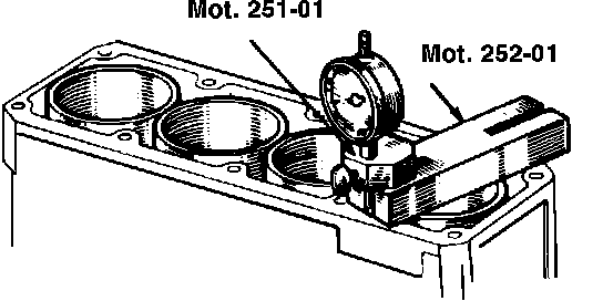 3. Place thrust plate Mot. 252.01 across each cylinder liner, Fig. 32, and measure liner protrusion above block with dial indicator.
