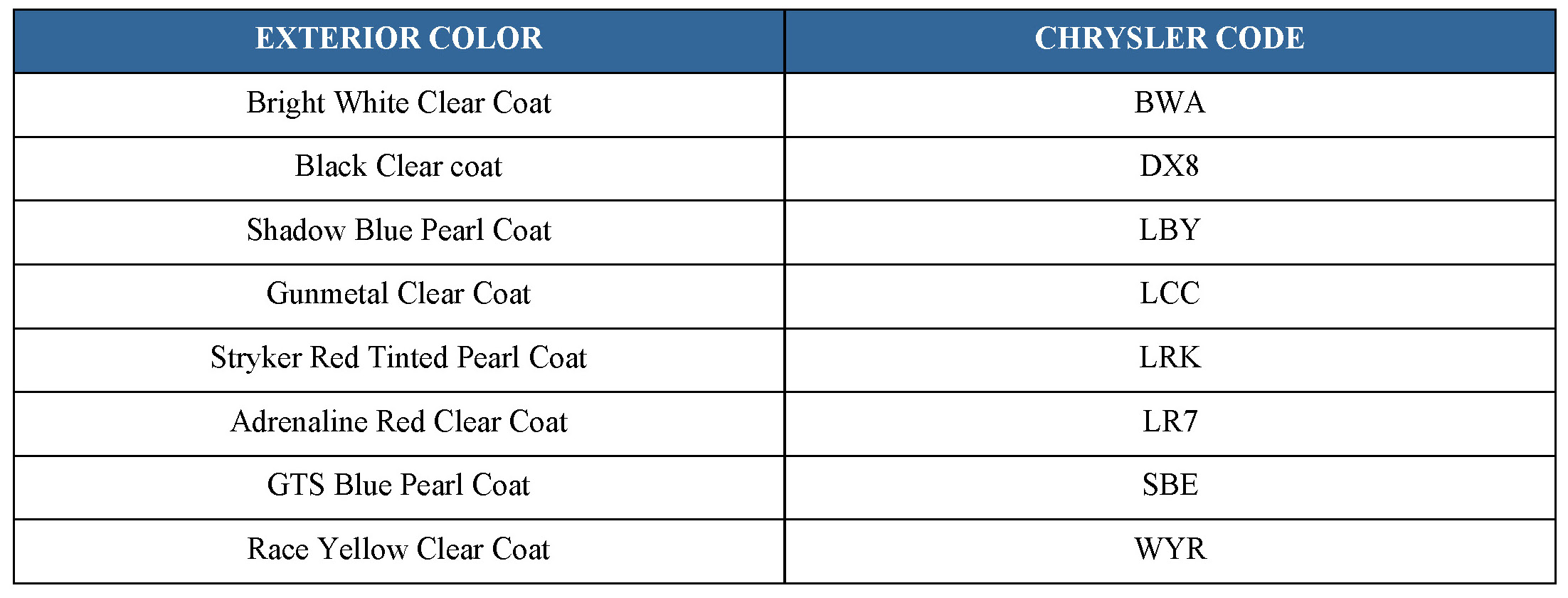 Exterior vehicle body color(s) are identified on the Vehicle Certification Label or the Body Code Plate.