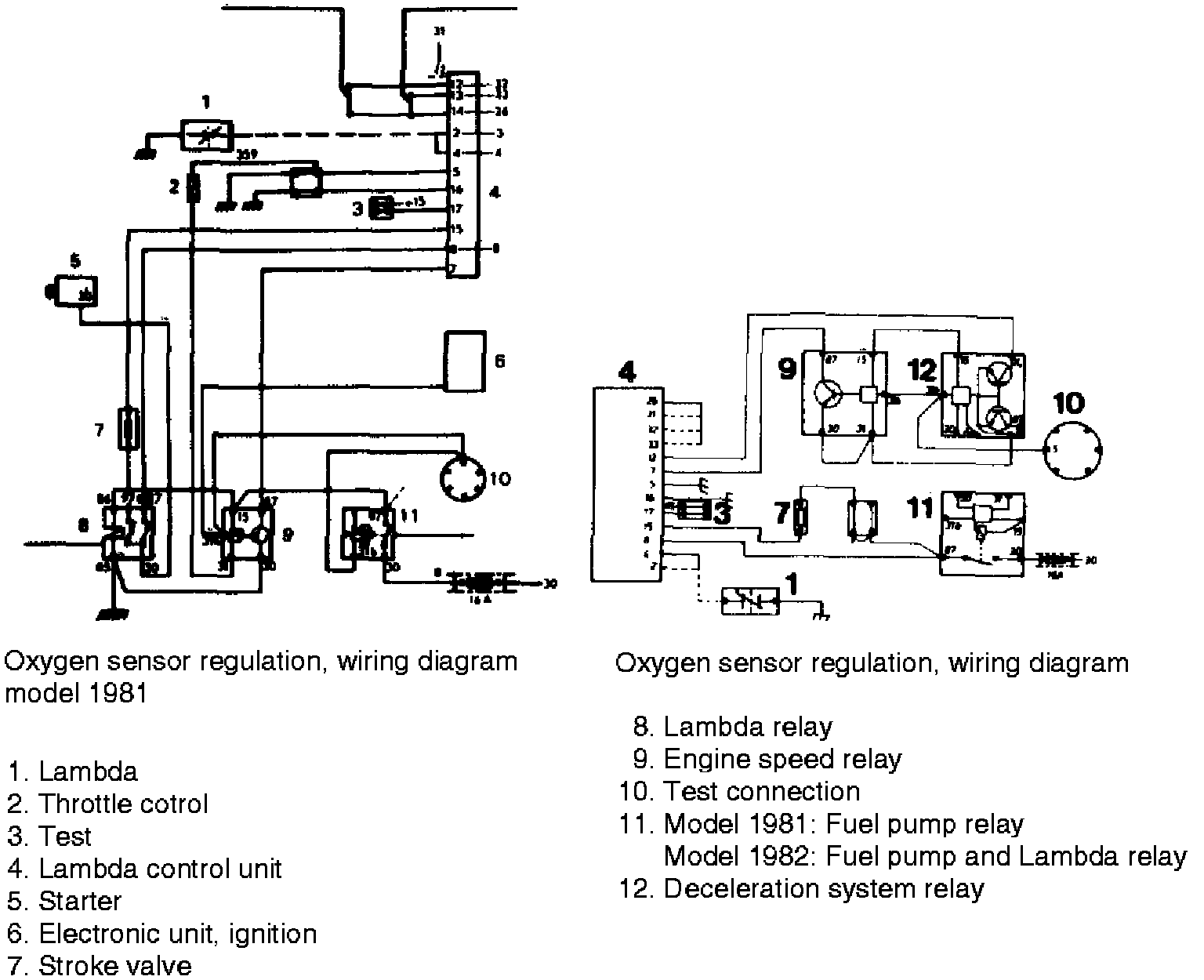 Oxygen sensor is connected to terminal 2 of control unit and is grounded through exhaust manifold. Cable to oxygen sensor is provided with a suppressor harness which is connected to terminal 4. A rest circuit with a connector piece is included to enable pulse measuring equipment to be connected. The connector piece is located at, relay holder and cables run to terminal 17 of control unit and terminal 15 in ignition system primary circuit.