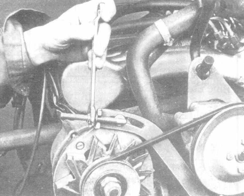 6. Install the new alternator, leaving the tensioning bolts slightly loose. Install the V-belt and tension it.