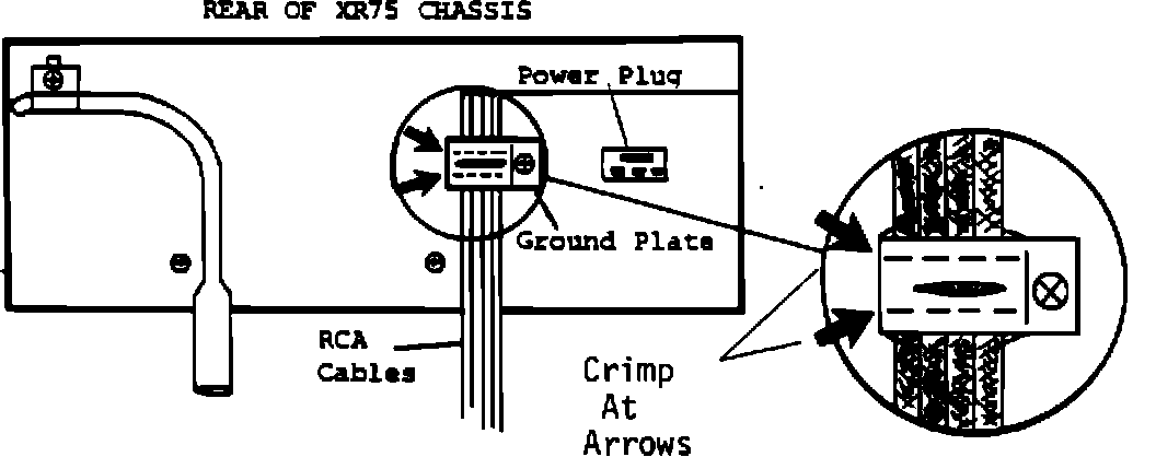 1. Unscrew the single Phillips screw and remove the square RCA ground plate from the radio chassis. Using a pair of diagonal cutters, crimp the ground plate along the top and bottom edges about 3 mm in, just enough to make definite ground contact between the plate and the RCA cable shields. Reinstall the plate to the radio making sure the screw is tight.
