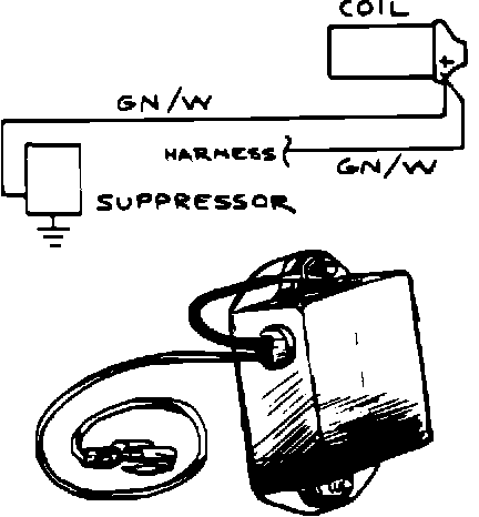 f. Attach the green/white lead from the suppressor to the coil terminal and connect the lead disconnected in Step d to the piggyback spade on the end of the suppressor lead.