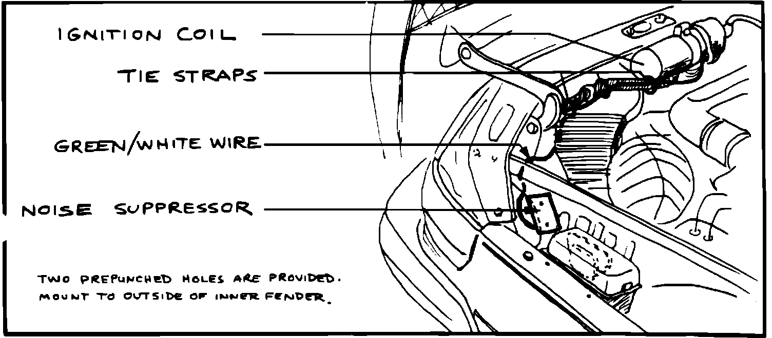 d. Run the green/white lead from the suppressor through the large opening in the inner fender, along the coolant expansion hose, under the hood hinge and along the wiring harness to the ignition coil. Fasten securely with nyloc tie straps provided. Check for hood hinge clearance.