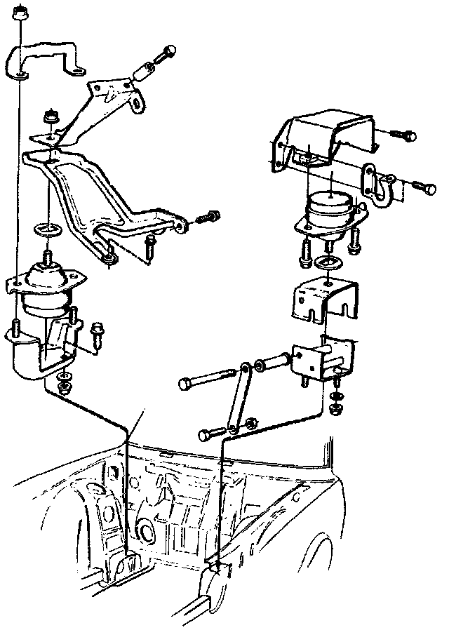 33. Remove all engine mounting bolts. In the left-hand engine mounting, the through bolt is fitted with a spacer sleeve. On cars to US specification, also remove the movement limiters from the front and righthand engine mountings.