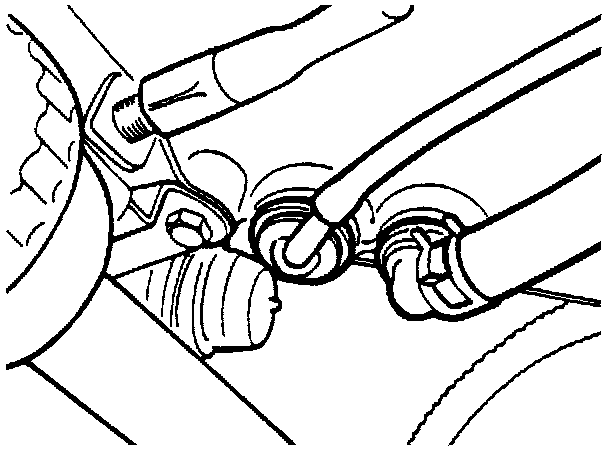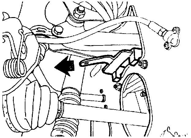 2. Fit tool 83 93 209 between the right-hand upper wishbone and the body. Turn the steering wheel to the right-hand lock and fit the tool from the wheel housing side.