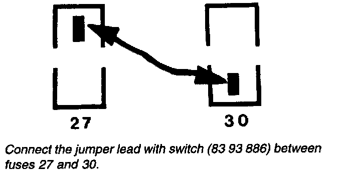 Remove fuse 30. Connect the jumper lead with switch (83 93 886) between fuse No.30 and fuse No.27, 28 or 29 so that current can be supplied to the fuel pump. Make sure that the switch is set to "OFF".