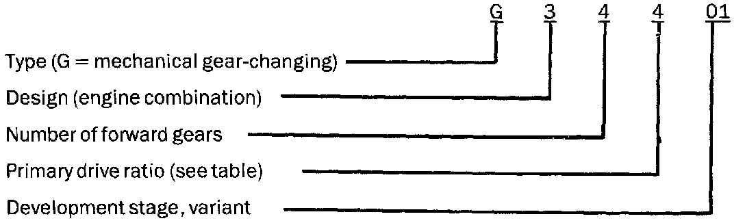 The type designation is stamped next to the gearbox serial number and signifies the following: