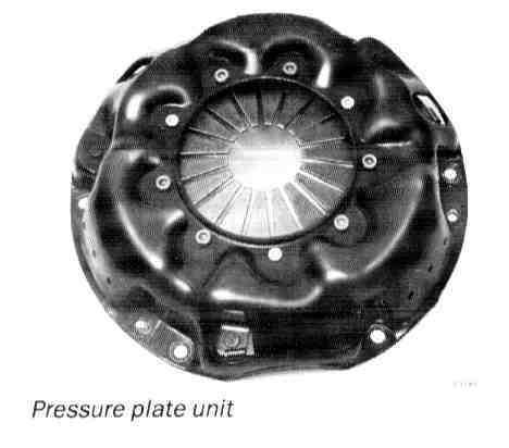 The pressure plate unit consists of the pressure plate, diaphragm-type spring and a sheet steel housing. The diaphragm spring serves as a lever and as a spring. The pressure plate unit must not be dismantled.