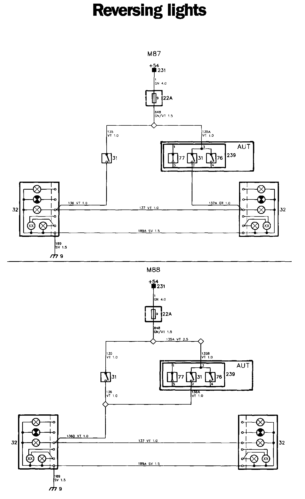The supply is taken from fuse 9 to reversing light switch 31. The contacts in the switch will close when reverse gear is engaged, and the lamps will light up.