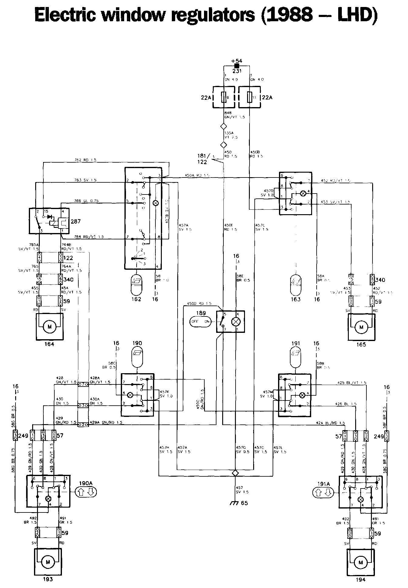 As an example, if switch 190 (for the left-hand rear door) on the centre console is depressed, one of the two pairs of contacts (depending on whether the window is to be raised or lowered) will close. Current will then flow to switch 190A in the left-hand rear door, through the switch and to regulator motor 193. It then flows through the second pair of contacts of the switch, back to the switch on the centre console and to earth.
