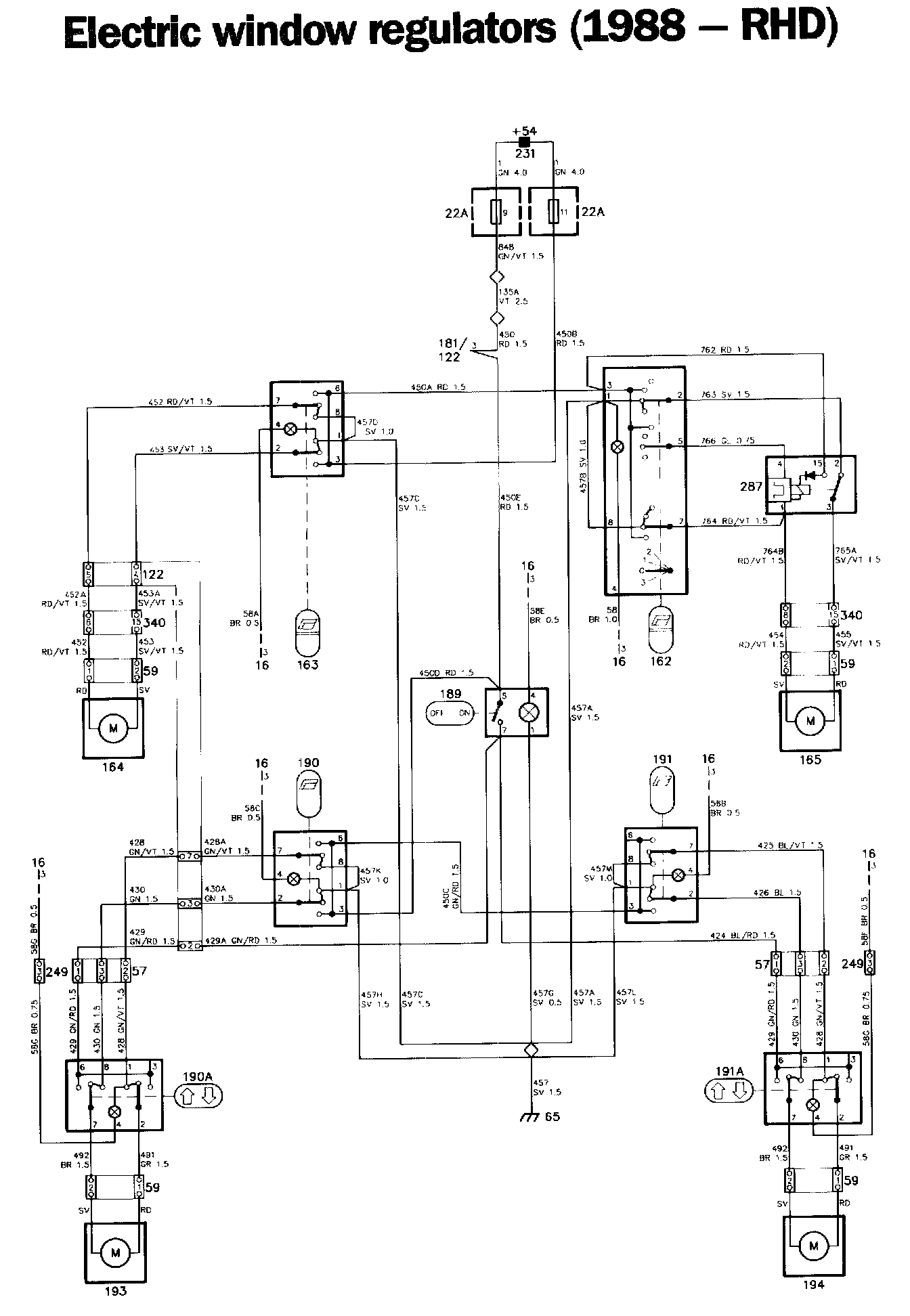 Check the automatic window regulator controls as follows: Set switch 162 to position 2 and check that the supply to pin 4 on the relay is live. Pin 1 of switch 162 should be earthed. Check that the supply to pins 15 and 3 on the relay is live.