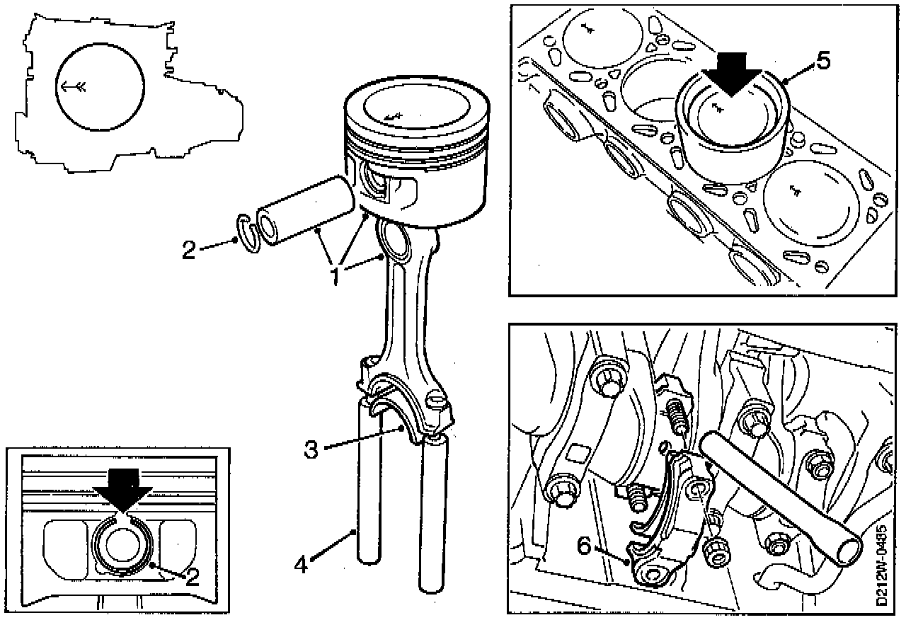 1. Assemble piston and connecting rod by driving in the gudgeon pin, using a rubber mallet and drift. Make sure that the notch in the piston crown faces the timing cover and that the numbers on the connecting rod face the exhaust side.
