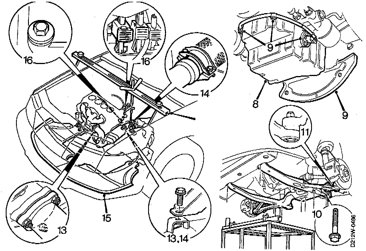 10. Position the sub-frame and fit it in position, then tighten as follows: