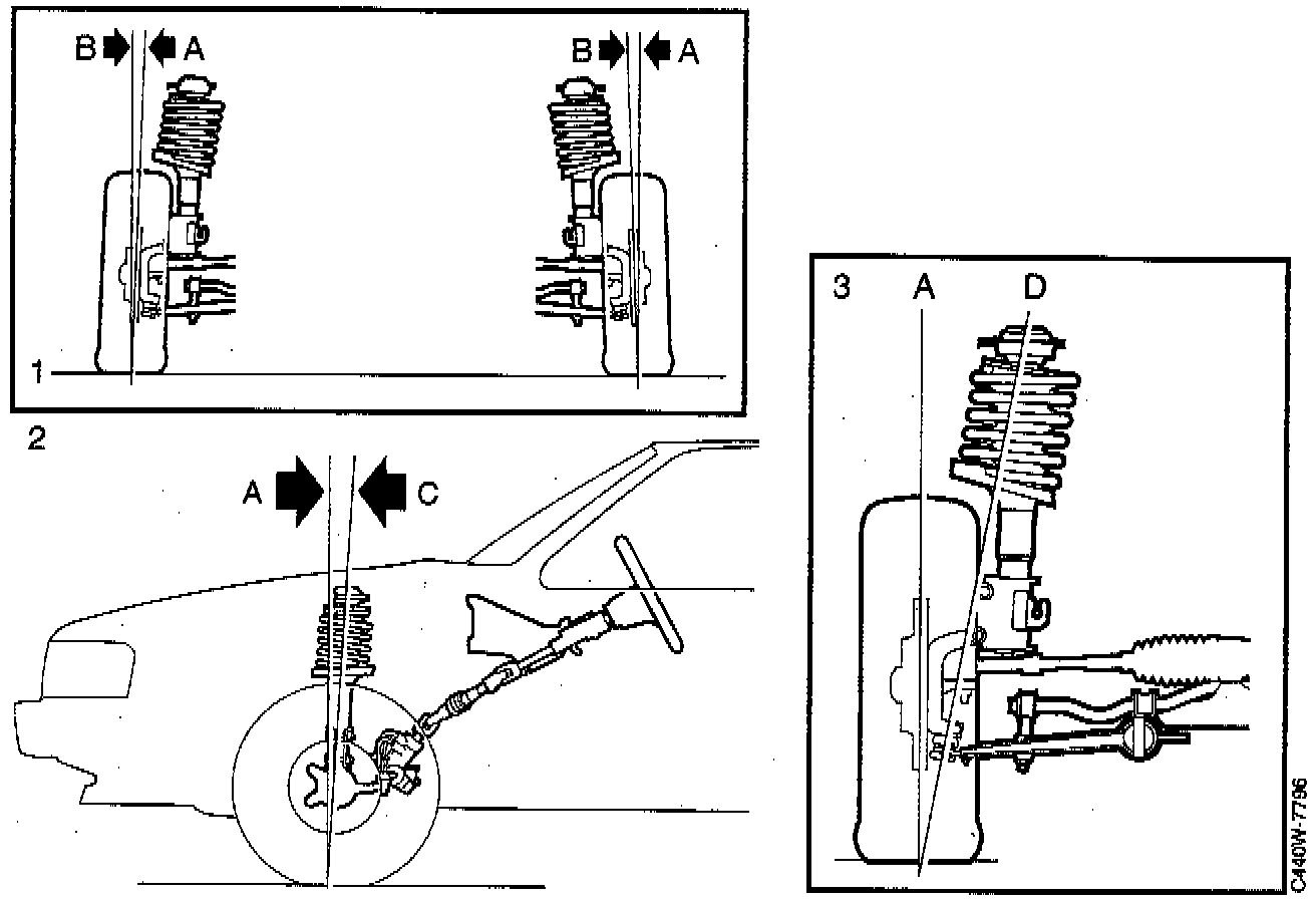 Camber (B) refers to the angle formed between the wheel and the vertical (A), No. 1, as shown. If the wheel leans outwards, the camber angle is said to be positive (+), if it leans inwards, the camber angle is said to be negative (-). The Saab 9000 has a negative camber angle.