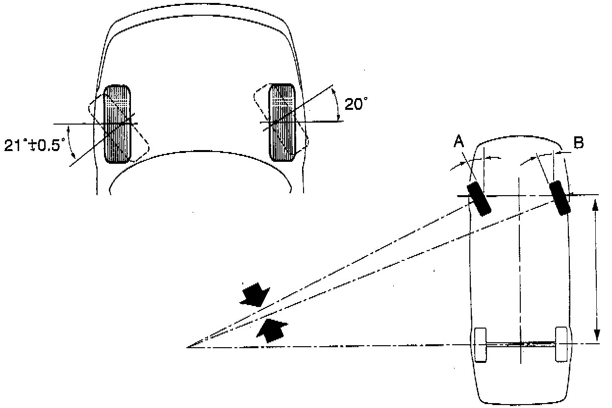 The toe-in value on the rear wheels is always measured in relation to the vehicles symmetrical alignment. The symmetrical alignment is an imaginary line between the middle point of the front and rear wheel axles.