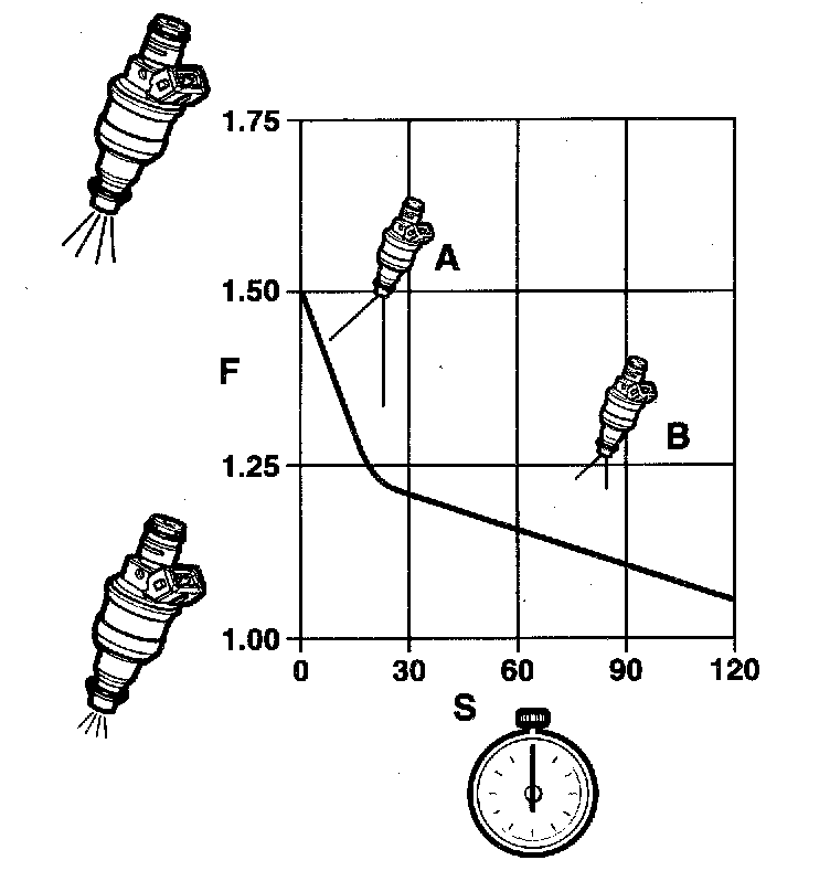 The engine warm-up period consists of two stages. The fuel enrichment factor (F) is higher during the first 20 seconds of operating time (S). This means that the injector opening duration is longer in section (A) of the curve.