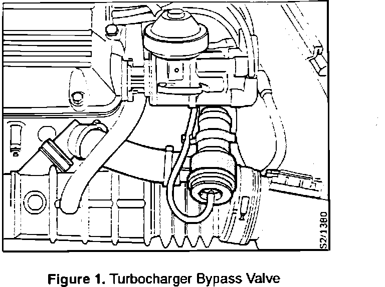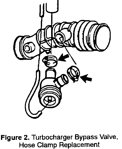 The Turbocharger bypass valve, Figure 1, is secured to the induction hose with plastic hose clamps, P/N 79 77 234. A service directive is being issued to update earlier cars with metal hose clamps, since the plastic hose clamps can crack under high temperatures. A cracked or broken hose clamp can result in poor starting or driveability.