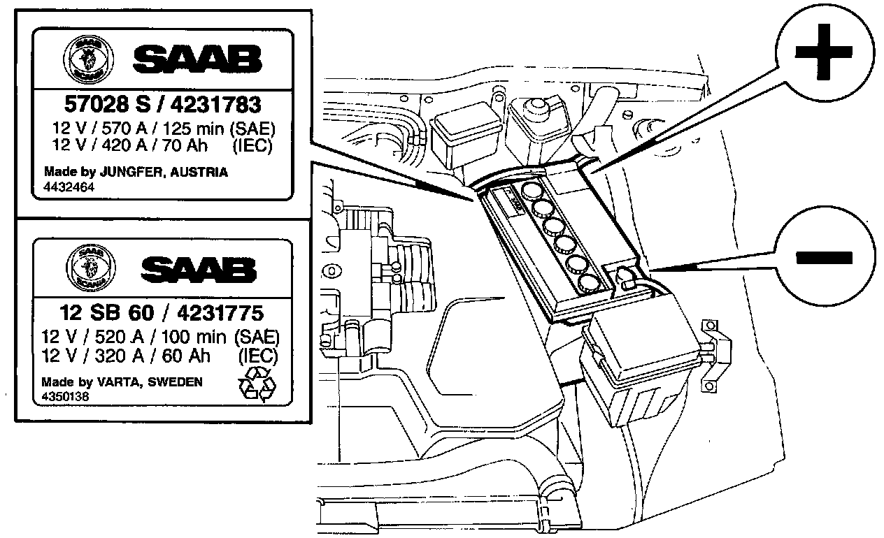 The battery is located in the engine bay on the left-hand side and its negative terminal is connected to ground (negative-ground system). On M95 and later models the battery is turned through 180° as shown above.