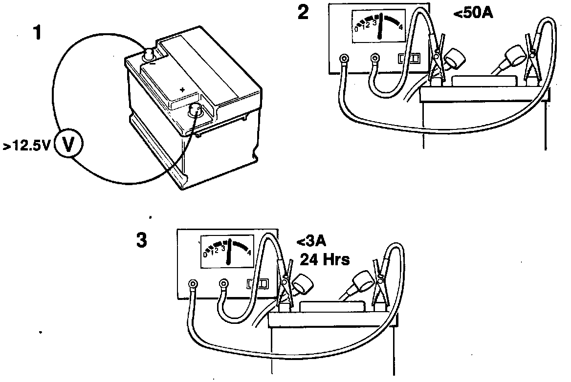 If the battery is almost fully discharged because a lamp or other item of electrical equipment has been left on for a relatively long time or has been forgotten, a low initial charge will be required to start the chemical process in the battery. In such cases, start charging the battery at about 3 A (never more than 5 A) for 24 hours or until the charging current has dropped to its lowest stable level.