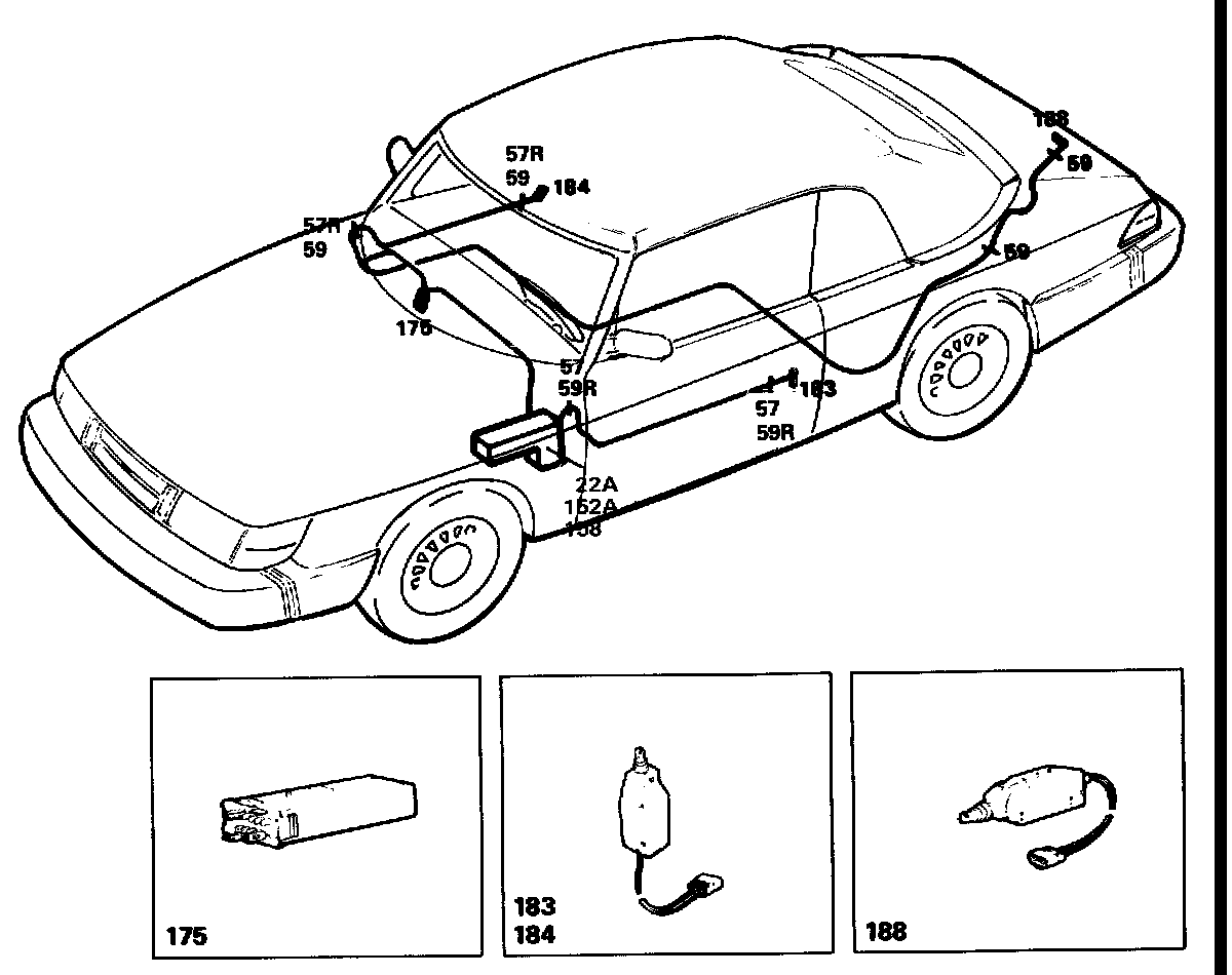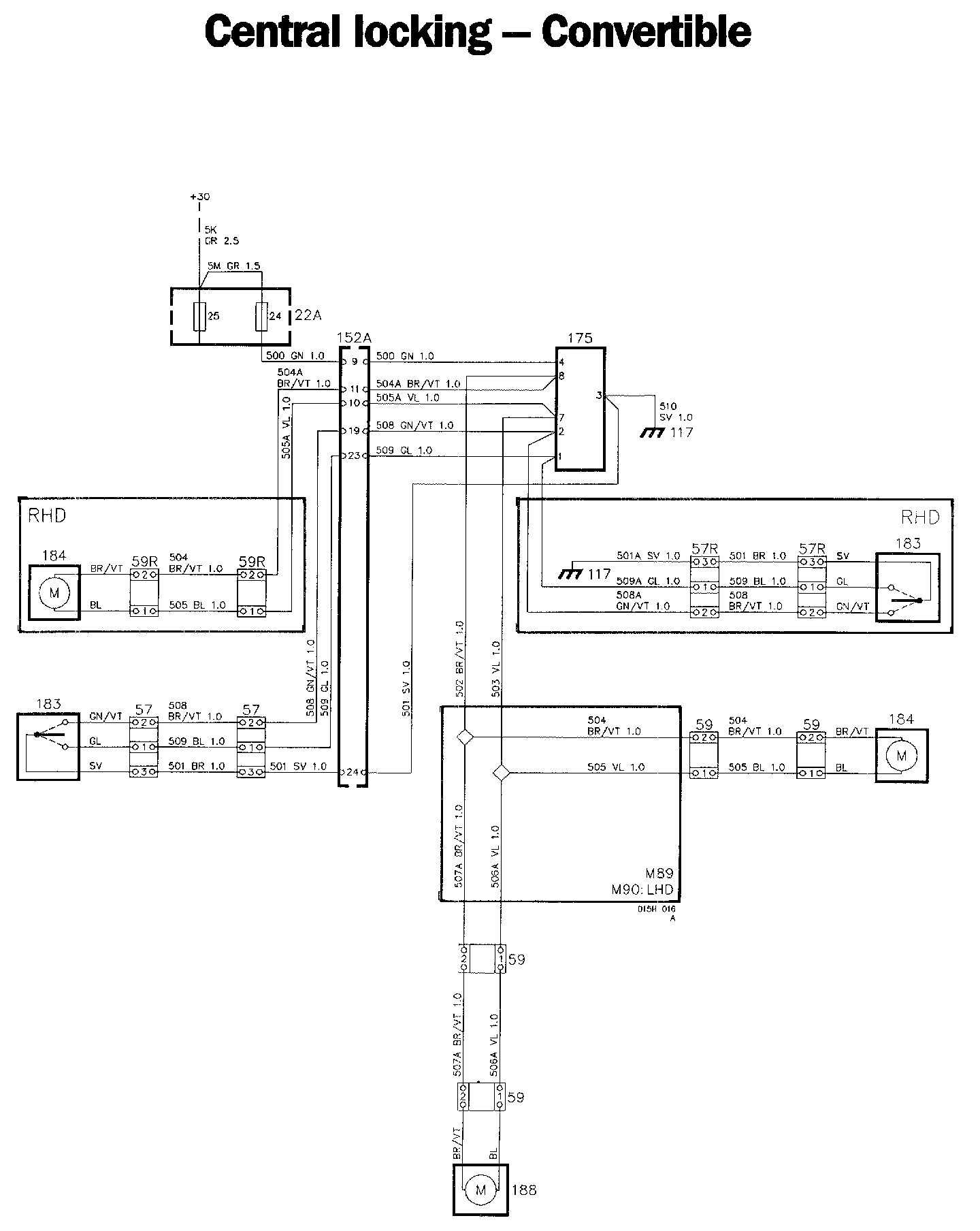 Terminal 4 of control unit 175 for the central locking system is continuously supplied from fuse 24, via 29-pole white connector 152A. The control unit is controlled by key switch 183 in the driver's door.