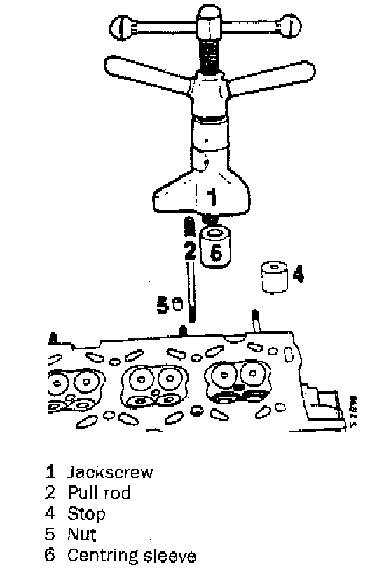 2. Center the tool in the valve seat and fit the guides using special tool 83 93 803 together with pull rod 83 93 811, stop 83 93 837, centering sleeve 83 90 379 and nut 83 93 845, or equivalents.