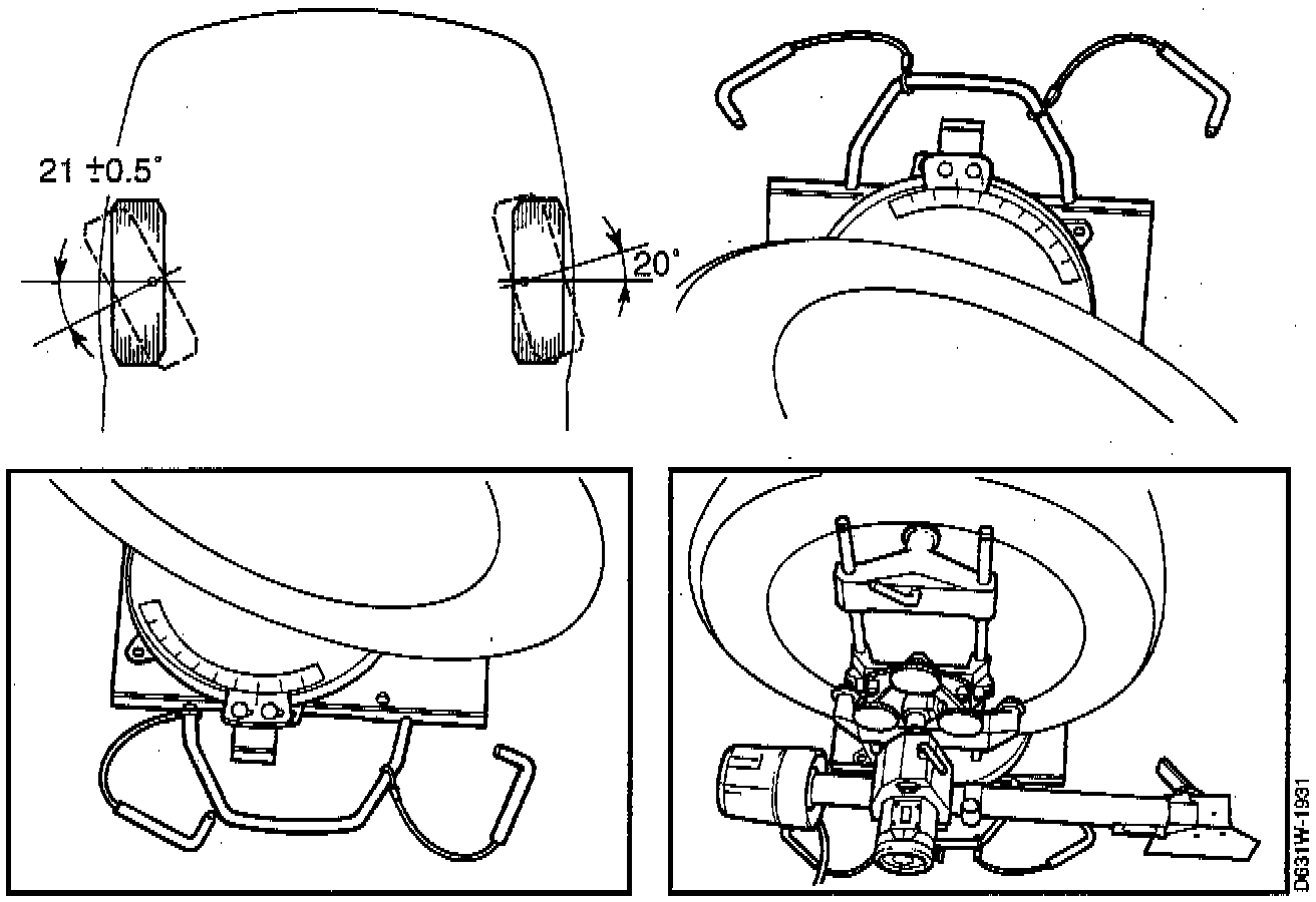 Example: Turn the steering wheel to the left until the righthand (outer) wheel is at an angle of 20°. If the steering angle is correct, the other (inner) wheel should be at an angle of 20.5 - 21.5°. If the measurement shows the steering angle to be incorrect, one or both of the steering members is distorted.