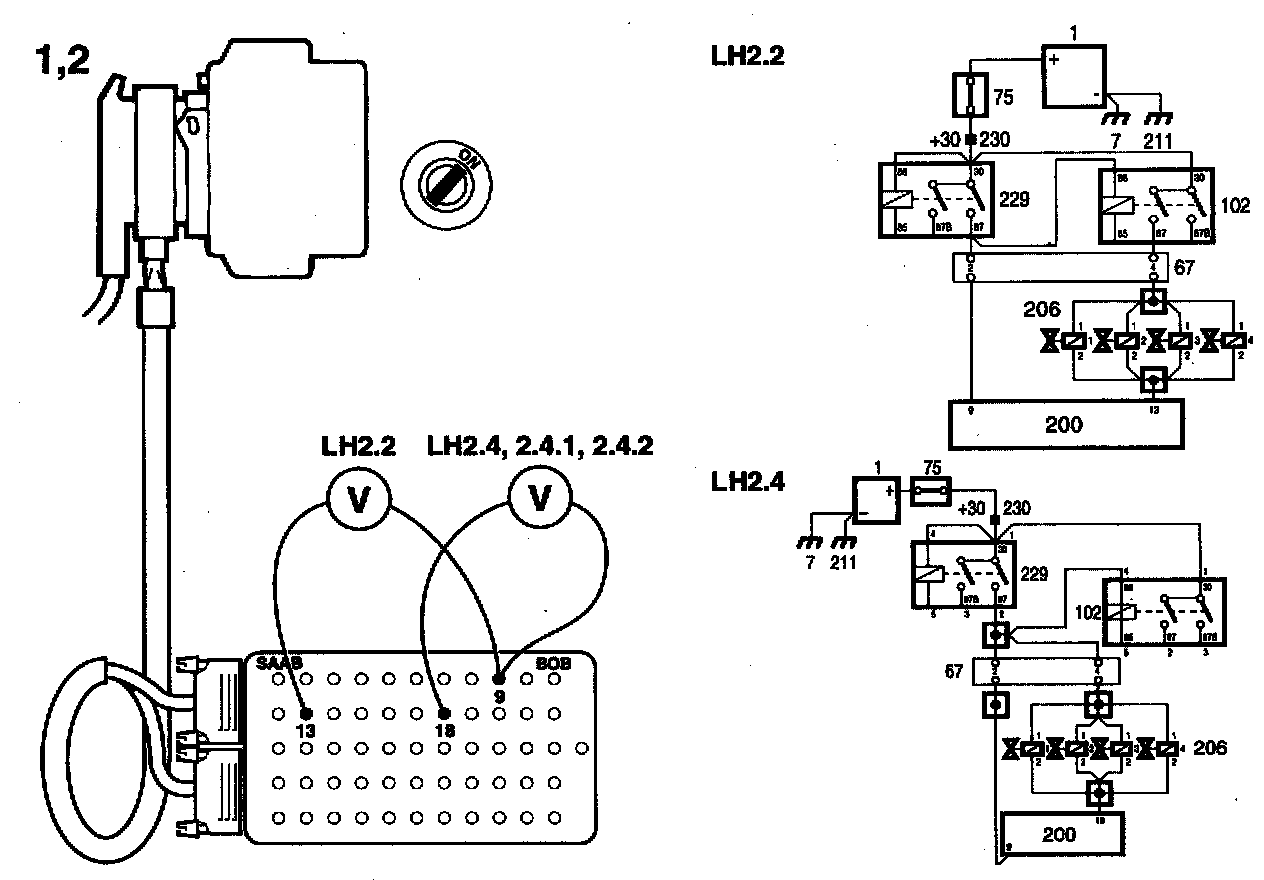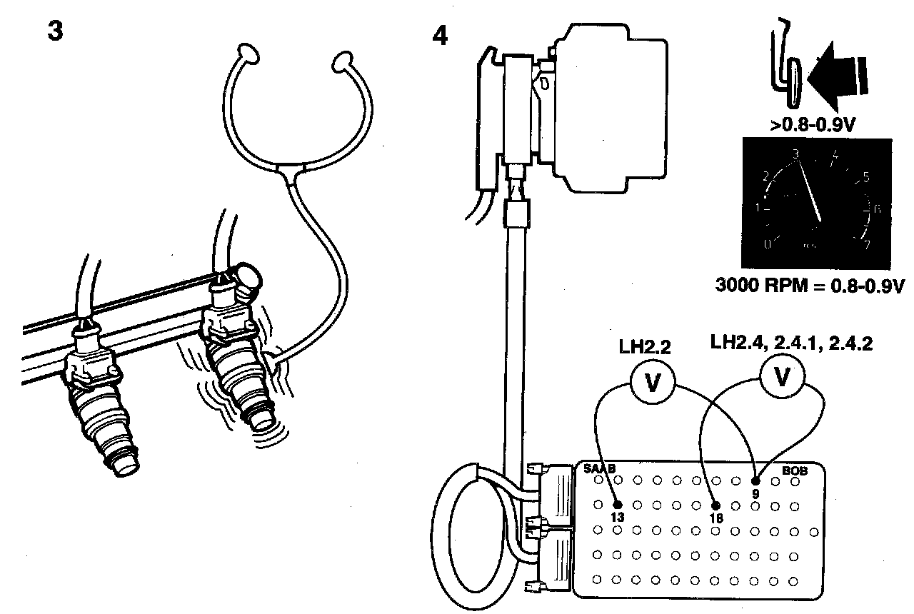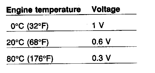 4 When the engine has reached its normal working temperature, increase engine speed slowly to 3,000 rpm. Take a voltage reading across the injector. The voltage should rise to 0.8 - 0.9 V. Allow the engine to drop to idling speed and then quickly accelerate it to 3,000 rpm. The voltage should now rise temporarily above 0.8 - 0.9 V and then drop back to 0.8 - 0.9 V.