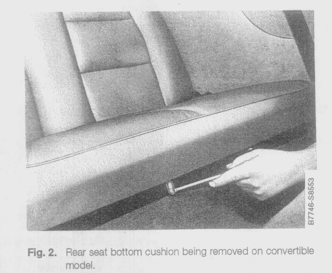 1. To remove the rear seat bottom, remove the bolts along the front edge of the seat bottom or remove the seat hinge bolts. See Fig. 2. Pull the seat out of the car.