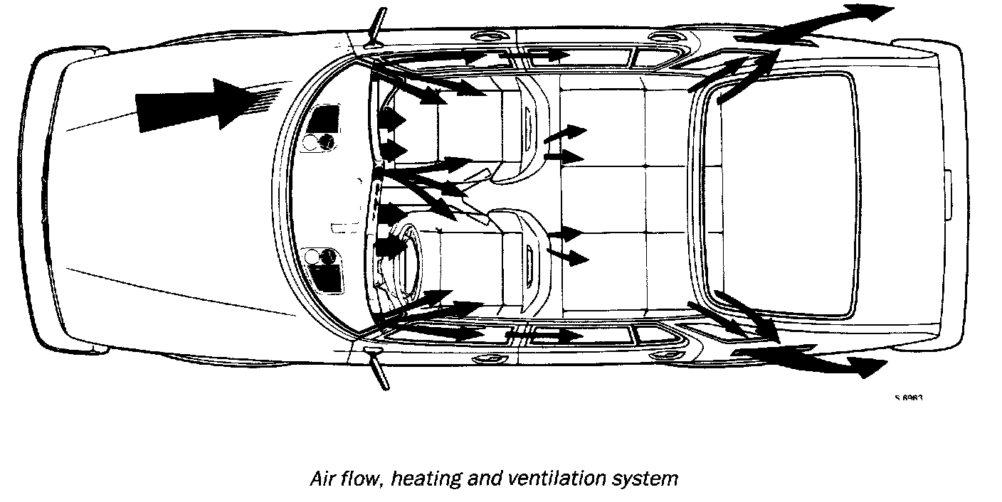 The air is drawn by the fan through the air intake on the right-hand side of the bonnet or is forced into the inlet by the ram effect when the car is travelling. The air then flows through an efficient filter which arrests particles of dust and dirt. The air then continues through the fan casing and heat exchanger and flows through various ducts to outlets in the facia and at the floor. Air from the interior is exhausted through special air outlets in the luggage compartment.