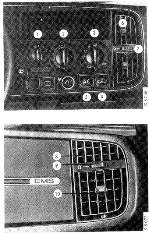 Apart from air to the central panel outlet, all air passes through the heat exchanger. The panel outlets can be closed and opened individually and, consequently, if the central panel outlet is shut, all air entering the car can be heated. In cars with air conditioning, the temperature control is used to regulate the temperature of the in- coming cooled air. The outer defroster nozzles for the side windows cannot be closed.