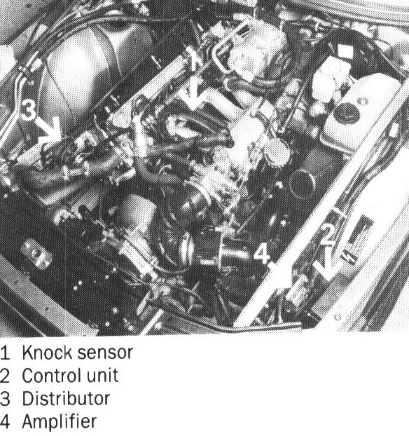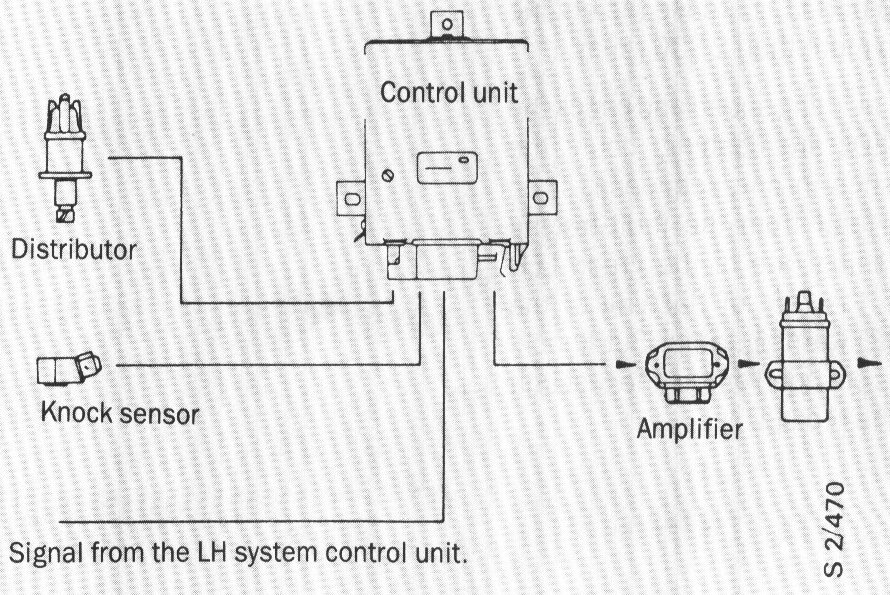 The electronic control unit receives signals from the knock sensor, the control unit of the LH system and the Hall sensor in the distributor. The signals are analysed in the electronic control unit and are compared with the information stored in its memory. The control unit then resets the ignition timing by transmitting signals to the ignition system, which opens the primary circuit of the coil and triggers the ignition spark.