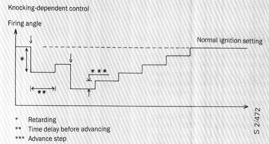 When knocking is detected in one cylinder, the ignition for that particular cylinder will be retarded in steps of about 3° until knocking has ceased or until the ignition has been retarded by a total of 13°. The ignition timing will revert to normal in steps of 0.350 per speed-dependent period.