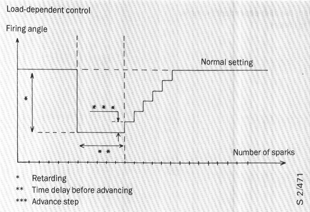 If an engine load change should exceed the predetermined value stored in the memory of the electronic control unit, the ignition will be retarded by about 6° on all cylinders simultaneously. When the load has ceased to increase, the ignition will be advanced back to the normal timing in steps of around 1°.