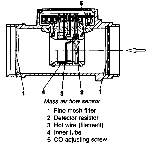 It consists of an aluminium body (plastic with effect- from 1989) enclosing an air duct. Centered inside the air duct is an inner tube incorporating a platinum filament (hot-wire sensor). On both the inlet and outlet sides the hot wire is protected by a fine-mesh filter.
