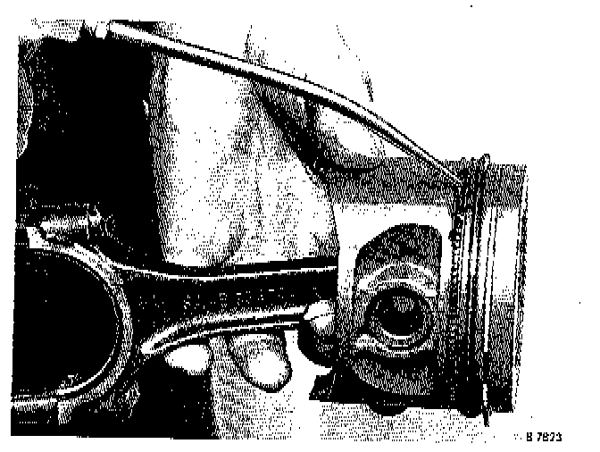 3. Install the pistons using piston ring compressor 78 62 287, or equivalent. Ensure that the notch in the piston crown points towards the timing cover and that the numbers on the connecting rod face the exhaust side.