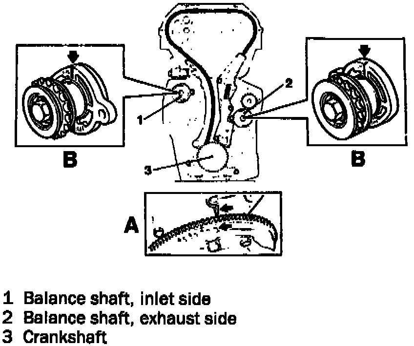 14. Install the balance-shaft chain and idler-wheel sprocket, ensuring that the timing marks on the bearing housing and sprocket are in line. On installation, leave some slack in the chain in line with the tensioner, and keep the chain reasonably taut by means of the top chain guide.