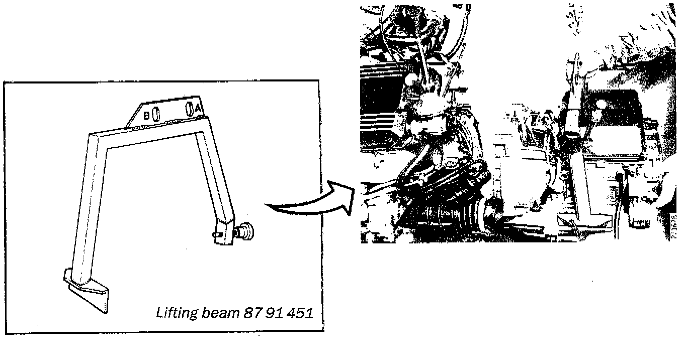 10. Install lifting beam 87 91 451, or equivalent onto the gearbox. Undo the securing bolts and lift off the gearbox.