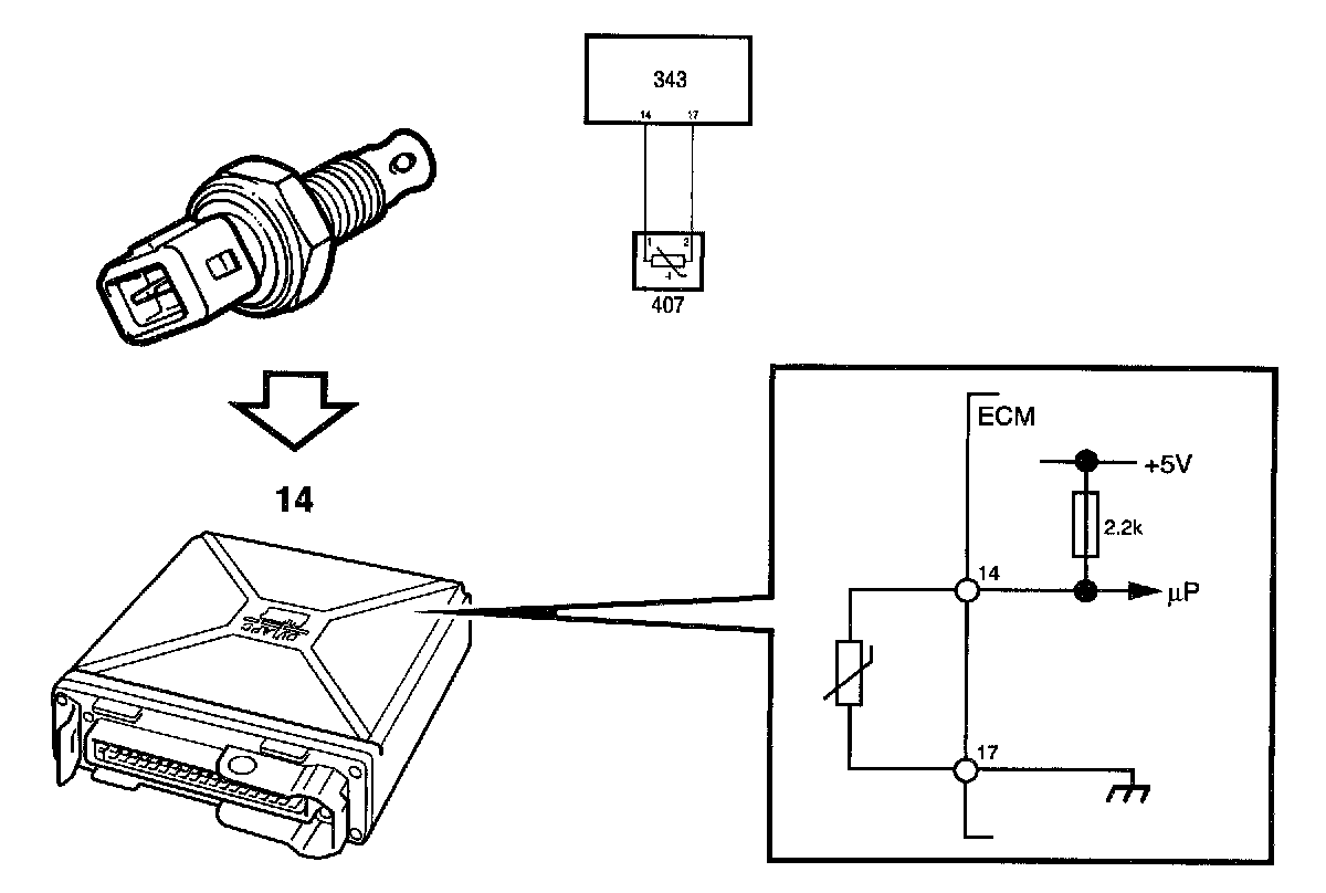 The control module measures the temperature in the intake manifold by applying 5 V to the sensor from pin 14 via an integral 2.2 Kilo Ohm resistor. The sensor is grounded via pin 17.