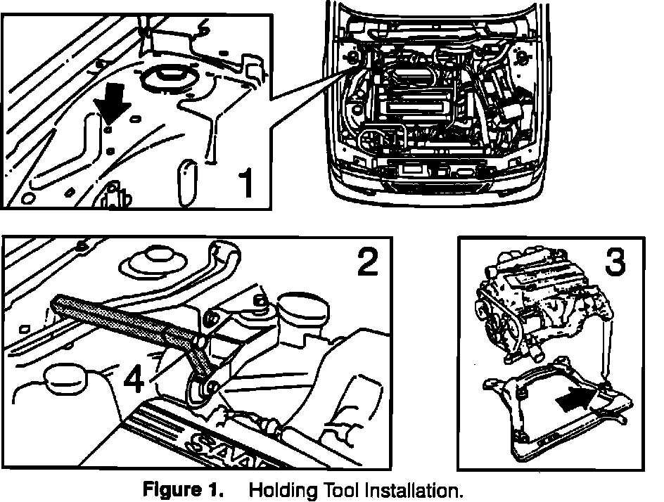 4. Carefully tighten the bolt on the holding tool to take the weight of the engine (4, Figure 1).