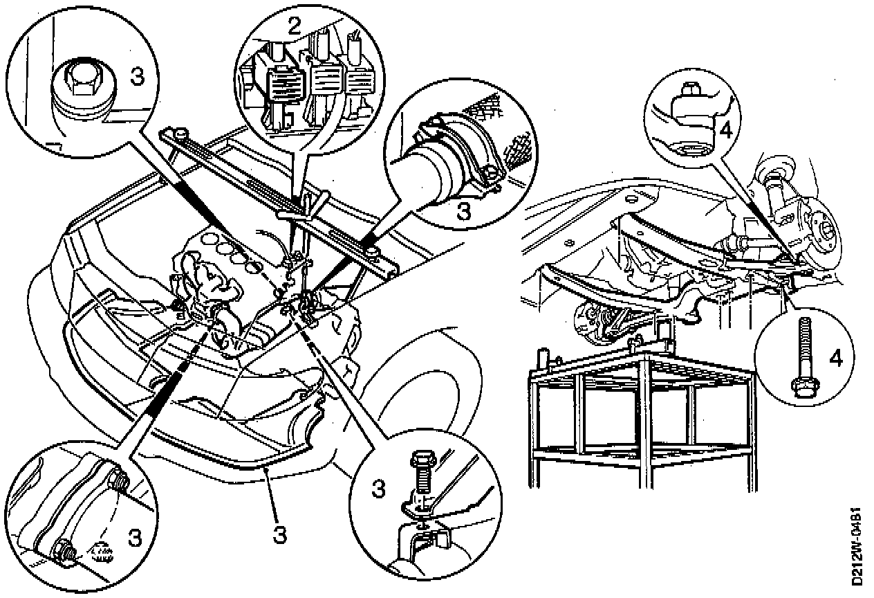 - Position a lifting table under the engine, raise the lifting table, undo the other bolts and remove the sub-frame.
