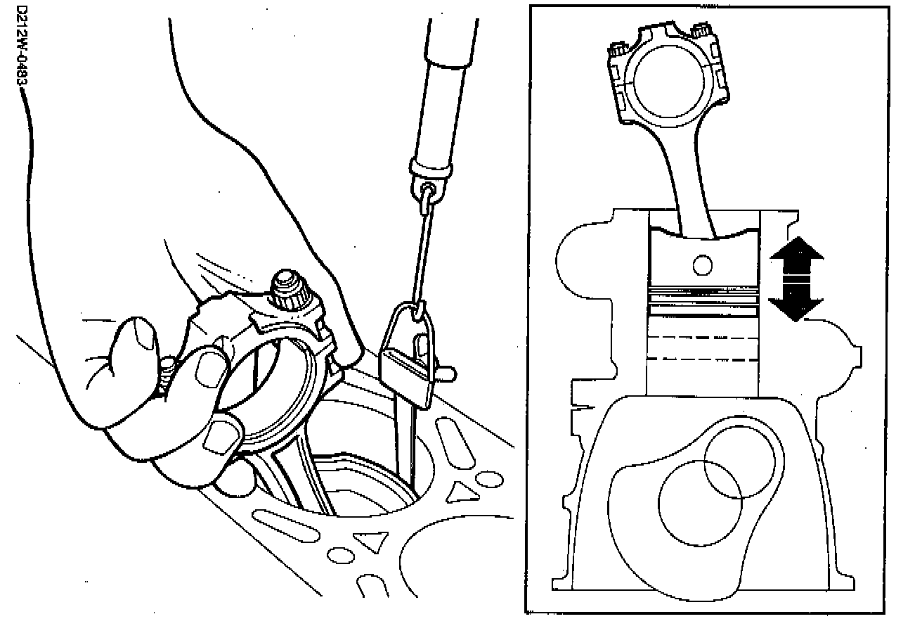 In No. 1 and No. 4 cylinders, the pistons cannot be fitted into the cylinder bores with a 0.05 mm or 0.04 feeler gauge inserted. With a 0.03 mm feeler gauge inserted the force necessary to withdraw it will be 20 N (4.6 lbs.) and with a 0.02 mm feeler gauge it will be 6 N (1.4 lbs.).