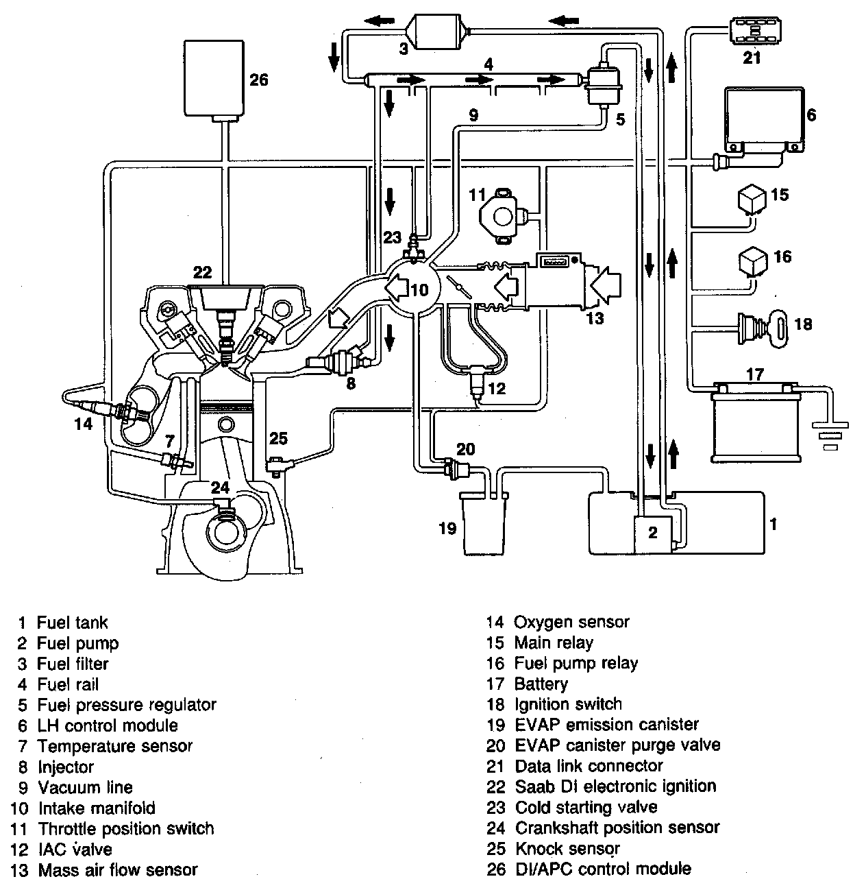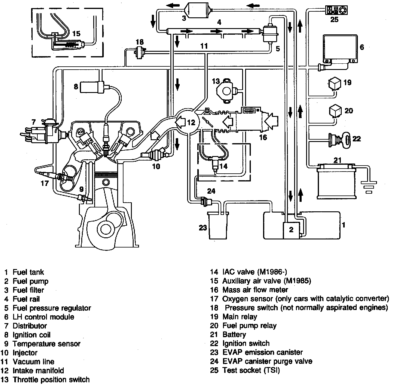 Signals from the temperature sensor (engine coolant temperature), or throttle position switch / sensor are sent to the control module. The control module is also supplied with ignition pulses from the ignition system and signals from the mass air flow sensor. On the basis of these signals and stored data, the control module calculates the opening duration of the injectors.