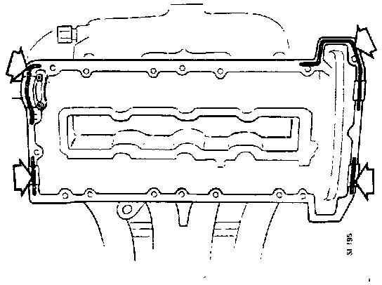 13. Install the split rubber plugs in the cylinder head. Apply beads of silicone sealant in the places shown.Install the camshaft cover.